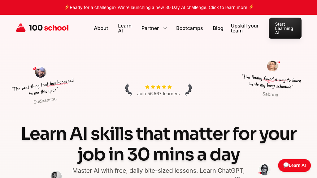 Summary 100 School provides an efficient method to learn tech skills with its daily 30-minute lessons. The platform is praised for its structured approach and the flexibility it offers through monthly challenges and live bootcamps, catering well to both beginners and those looking to enhance their existing skills.