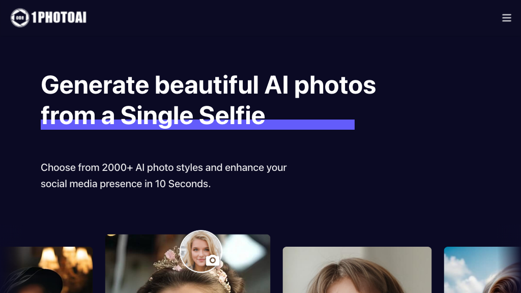 1PhotoAI is an AI tool that generates high-quality photos and avatars from a single selfie in about 10 seconds. - How do I create an AI photo with 1PhotoAI?