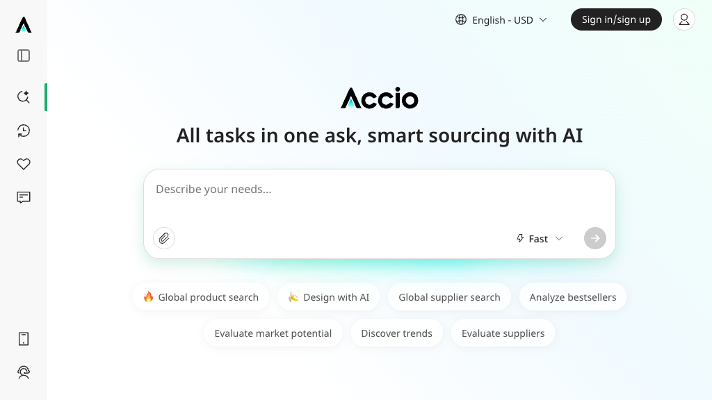 Accio is an AI-powered sourcing engine designed for SMEs, streamlining product discovery and supplier matching with market insights.