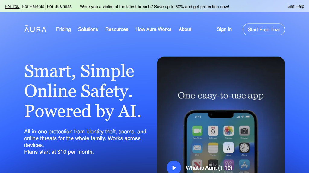 Aura is a digital safety platform offering protection against identity theft, fraud, and online threats, ideal for individuals and families.