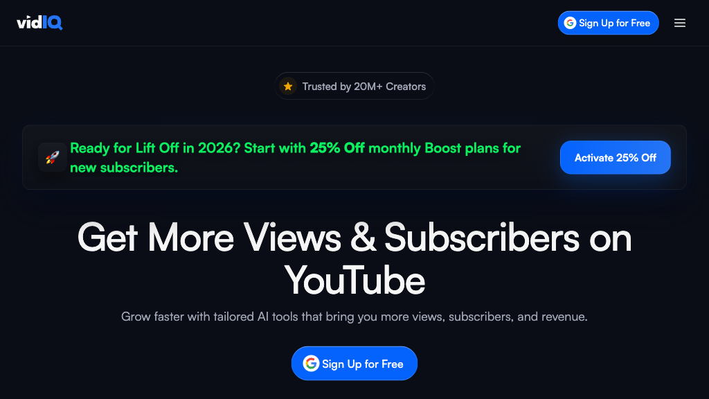 vidIQ is an AI-driven platform that helps YouTube creators optimize their videos, grow their audience, and increase views through data-backed tools. - How does vidIQ help improve video performance?